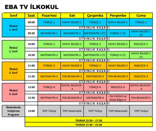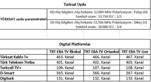 3 farklı kanal, HD (yüksek çözünürlüklü) ve SD (Standart çözünürlüklü) olmak üzere toplam 6 kanaldan yayın yapılacaktır. Hangi kanallar olacak? TRT-EBA TV İlkokul, TRT-EBA TV Ortaokul ve TRT-EBA TV Lise olmak üzere 3 kanal uzaktan eğitimde kullanılacaktır. TRT-EBA TV televizyon kanalları yayın akışlarına nereden ulaşabilirim? Yayın akışlarına "eba.gov.tr" ana sayfasından ve TRT internet sitesinden günlük ve haftalık yayın akışına ulaşılabilecektir. Ayrıca, her akşam yayın sonlandıktan sonra ve sabah yayın başlayana kadar televizyon ekranından görüntülenebilecek. Öğrenciler gün boyu TV başında mı olacaklar? Öğrenciler, TRT-EBA TV ve "eba.gov.tr" üzerinden yayın akışını takip ederek, kendi sınıflarına ait ders anlatımlarını, o haftanın hangi gününde ve saatinde yapılacağını öğrenecek ve kendileri için belirlenen saat aralığında yayını takip edeceklerdir. O saatler dışında ekran başında olmaları gerekmeyecek. TRT-EBA TV yayınlarının tekrarları olacak mı? Yayınlar aynı kanalda ve gün içinde 1 veya 2 kez tekrar edilecek. Tekrarlayan yayın akışı da yine "eba.gov.tr" ve TRT internet sitelerinden öğrenilebilecek. Ayrıca "eba.gov.tr" üzerinden de yayınlanan içeriklerin kayıtlarına ulaşılabilecek. Dersi hangi öğretmenler anlatıyor? Milli Eğitim Bakanlığının seçtiği, alanında başarılı öğretmenler ders anlatım videoları ile konuları anlatacak.