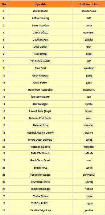 Sitemize üye girişi yaptıktan sonra kişisel sayfanıza girerek bir çok uygulamadan faydalanabilirsiniz. Arkadaşlarınıza ve bana özel mesajlar gönderebilirsiniz. Sitemizde yayınlanmasını istediğiniz yazılarınızı ve resimlerinizi gönderebilirsiniz. Tüm arkadaşlarınıza toplu olarak mesaj gönderebilirsiniz. Üye girişi yapmayanlar sınav modülü gibi sitemizin bazı özelliklerinden faydalanamazları. Kullanıcı adınızı ve parolanızı değiştirmeyin. Ancak eksik bilgileri (adres, telefon vb.) girebilirsiniz. Yeni kullanıcı isimlerinizi aşağıdaki listeden bakarak öğreniniz...