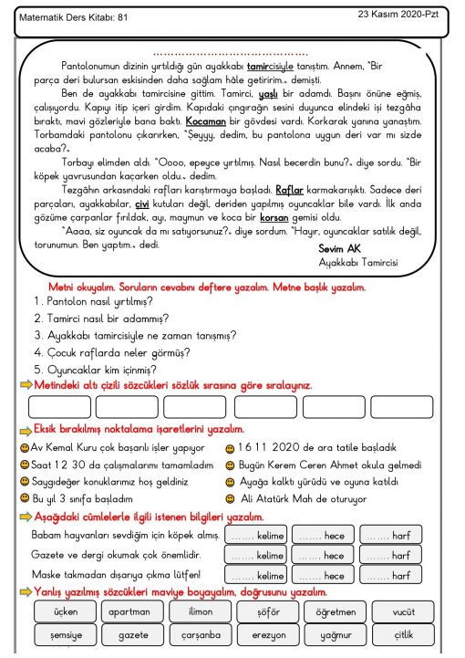3 / H - Türkçe_Matematik - Hikaye kitabımızdan her gün bir ...