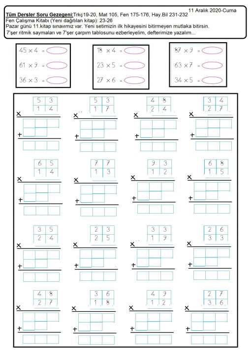 7'şer ritmik saymaları ve 7 şer çarpım tablosunu defterimize yazıp ezberleyelim....