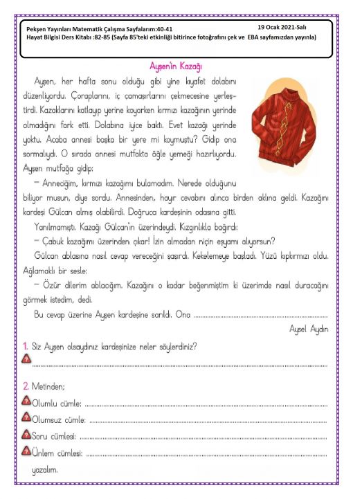 Hayat Bilgisi Ders Kitabı sayfa 85 deki etkinliği bitirince EBA sayfamıza yükle...