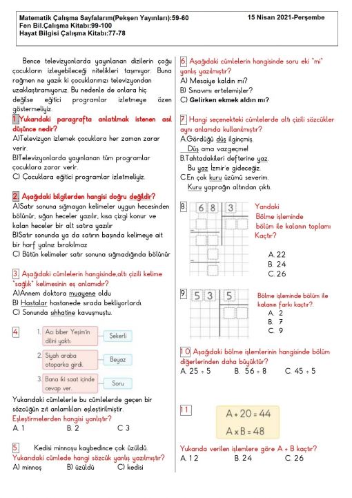 3 / H - 24 Haziran 2021-Perşembe - Türkçe-Matematik-Hayat Bilgisi ...