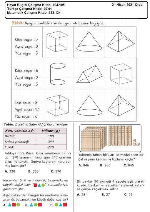 3 / H - 5 Mayıs 2021-Çarşamba - Matematik-Fen-Hayat Bilgisi çalışma kitaplarından ödevlerimiz ...