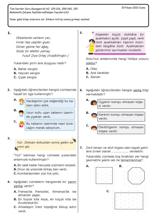 3 / H - 30 Nisan 2021-Cuma - Pazar günü kitap sınavımız var. ...