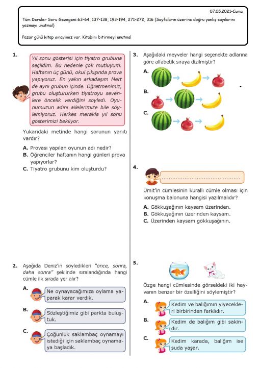3 / H - 7 Mayıs 2021-Cuma - Pazar günü kitap sınavımız var. ...