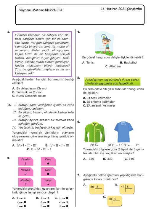 3 / H - 16 Haziran 2021-Çarşamba - Okyanus matematik ...